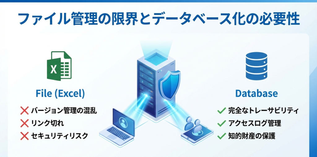 また、ファイルサーバーに置くだけでは、「誰が・いつ・どの項目を閲覧・編集したか」という詳細なアクセスログも残りません。