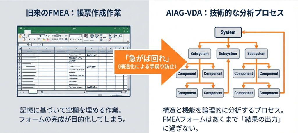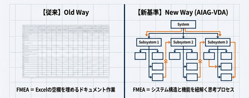 従来、FMEAといえば「Excelの表を埋める作業」と捉えられがちでした。しかし、AIAG-VDA規格では、この認識を変える必要があります。