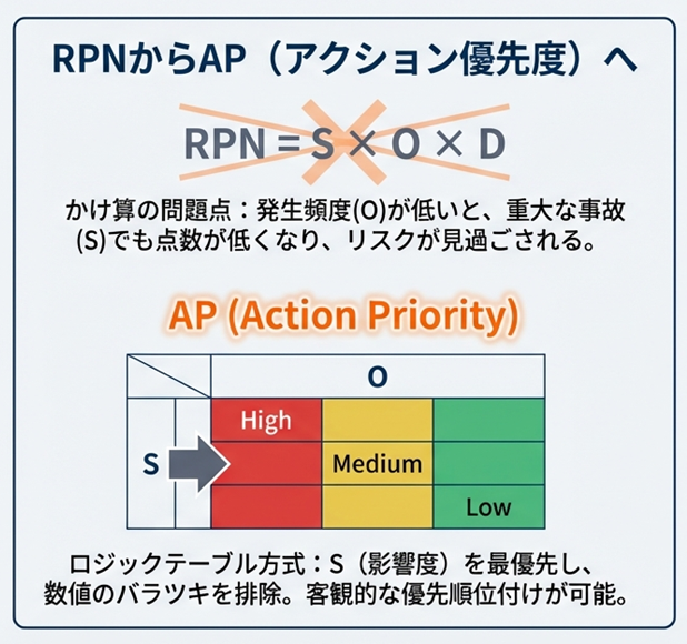 最後に、これらS/O/Dの3つの組み合わせから、規格で定められたロジックテーブルに基づき、AP(アクション優先度:High/Medium/Low)が決定されます。