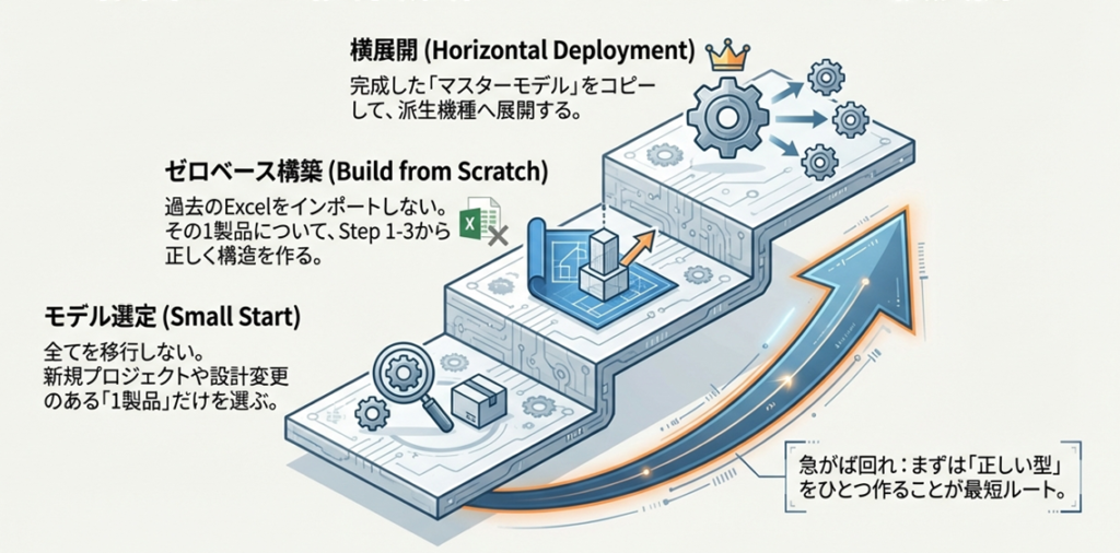 まずは「重要な部品」や「新規開発ユニット」など、対象範囲を限定したモデルケースを一つ作ってください。