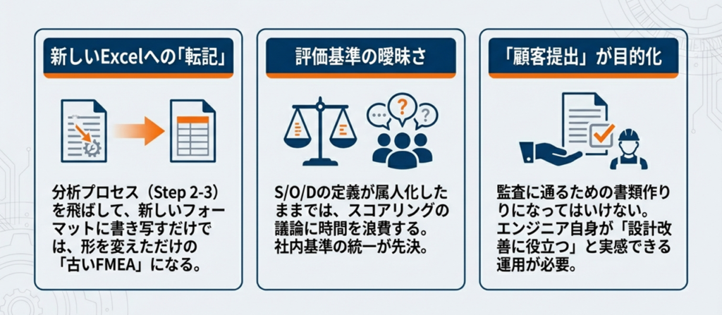 このプロセスを経ずに、ただ新しい表の空欄を埋めるだけの作業は、実態としては形を変えただけの「従来のFMEA」です。